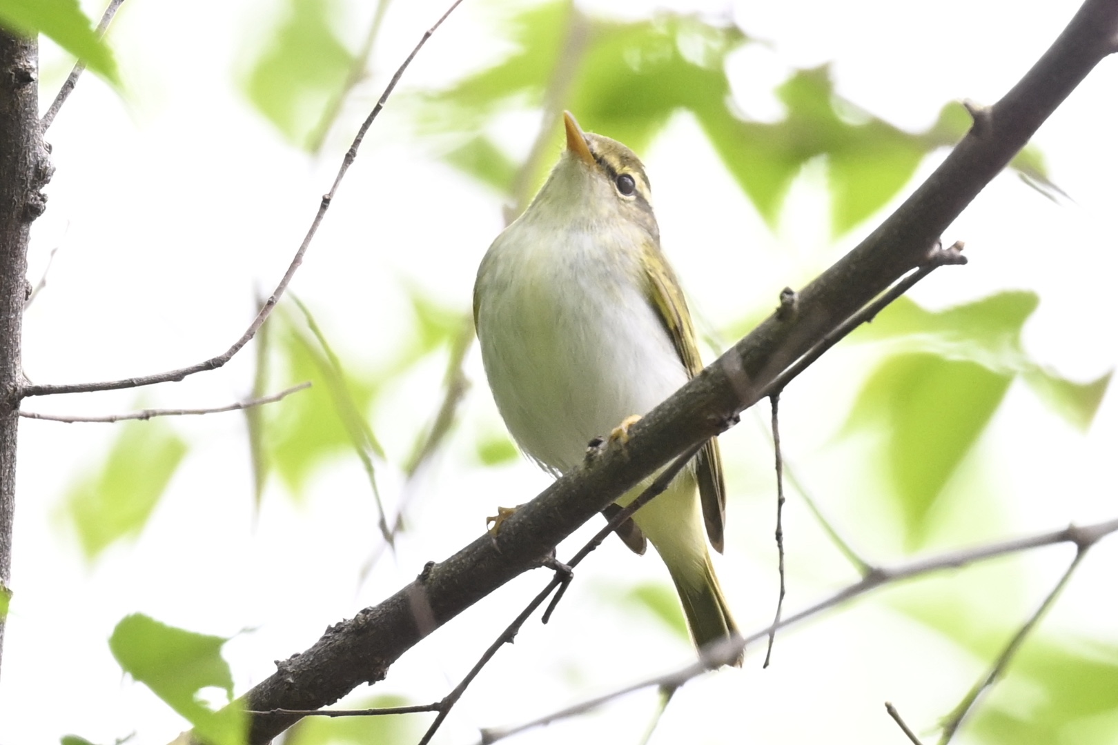最初の観察地に入っていくと、遠くからエゾムシクイの鳴き声が聞こえました。観察地をざっと確認し、声のほうへ向かいます。住宅地の庭木にいるかのように聞こえましたが、やはり緑が濃い林の中心部でした。今シーズン初認です。現場ではセンダイムシクイとキビタキも鳴いていました。夏鳥3種盛り合わせの楽しさで、さらにキビタキが複数いるという濃さです。どこに狙いを定めるか迷いますが、ここはシーズン初認のエゾムシクイとの対決しかありません。エゾのヒーツキー ヒーツキーという高音の鳴き声はよく聞こえますが、姿を見つけるのは簡単ではありません。動きを捉えても、幾重にも重なる新しい葉によって、とまった位置はよく見えません。おまけにヒヨが追い払ってしまうことも。大きなケヤキの梢近くにいるのを証拠撮影しようと試みますが、顔を見せてくれません。何度か姿を捉えるも胸から尾までで、アラカシの暗がりに移動したところで諦めることに。対決に手間取っているうちに、周囲のキビタキやセンダイムシクイの声は遠ざかっています。それにしても美しい声でした。