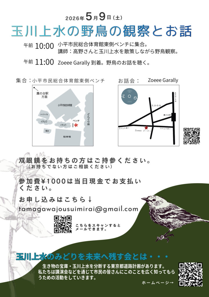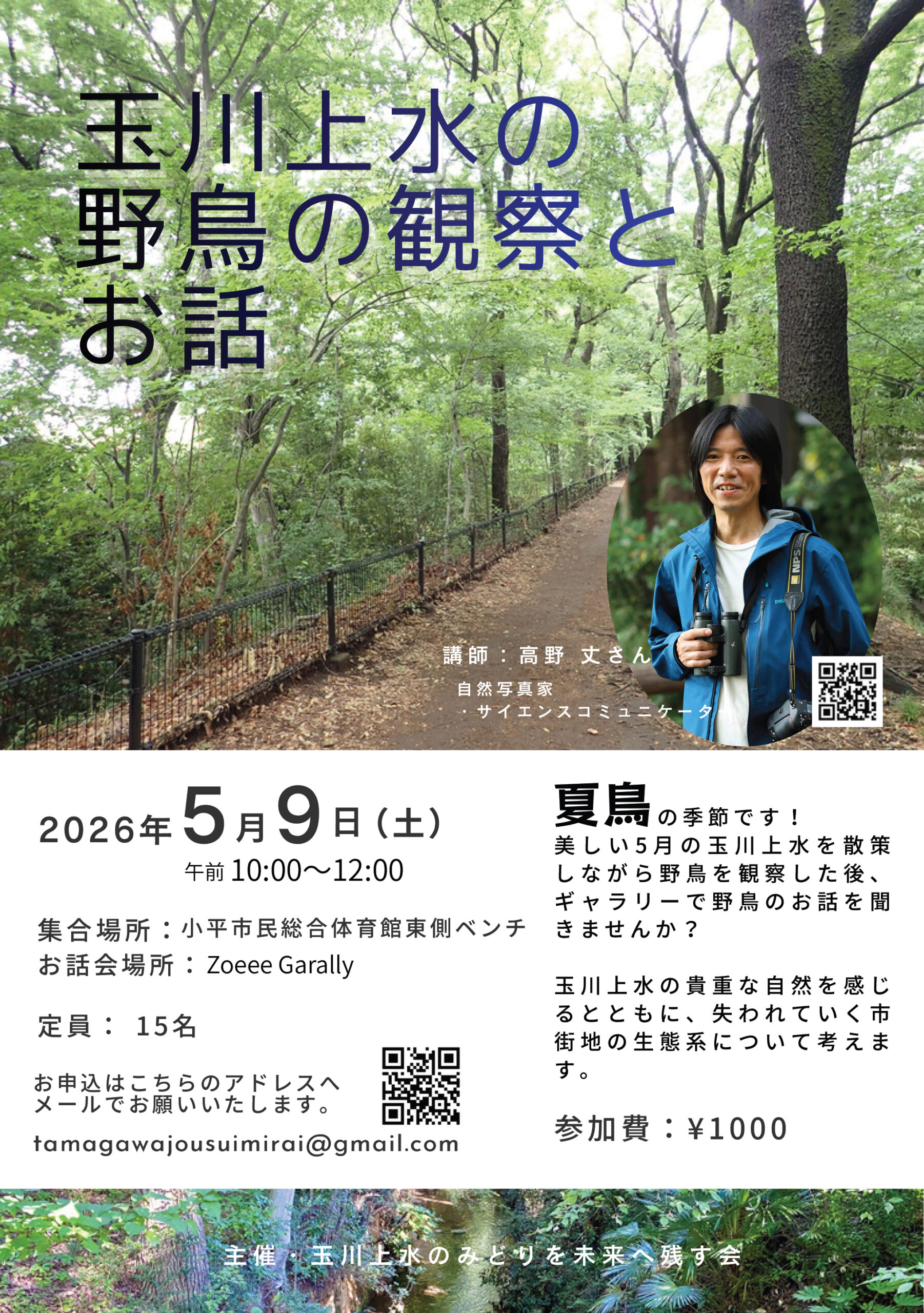 進んでいなかった昭和の道路整備を蒸し返し、小平市鷹の台にある市民にも生きものにも大切な林「どんぐり林」の大部分に道路を通すという計画を15年近く前に知りました。わたしは「どんぐりの会」の方々にお会いし、生物調査と観察会の開催を提言。「どんぐりの会」を中心に、地域のほかの市民団体とも交流しながら、春の渡りと冬場の鳥類調査・観察会、変形菌の観察会、セミの抜け殻調査などの活動をご一緒してきました。「どんぐり林」は小さな雑木林ですが、調べれば調べるほど、観察すればするほど、自然の奥深さが見えてくる不思議な場所です。今回は「玉川上水のみどりを未来へ残す会」さんの依頼で、1時間程度のミニ野鳥観察会を案内し、林と周辺の野鳥について講演します。