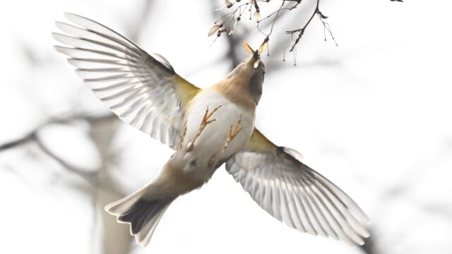 写真:ホバリングしてイロハモミジの種を採るアトリ昨日とは対照的に、ぐずついた空模様。ムクドリが電線に集まっています。その数、20羽以上。林の入り口ではカワラヒワがさえずっていました。
