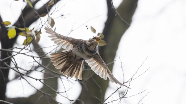 キュキュ 林の入り口に着くまでに、住宅地上空を飛ぶツグミを10羽確認しました。公園内でもよく飛んでいます。最初の観察地では、ほとんど実の在庫がなくなったエノキに1羽のツグミがいました。在庫わずかな実は食べにくい位置にあるもので、ツグミは一...