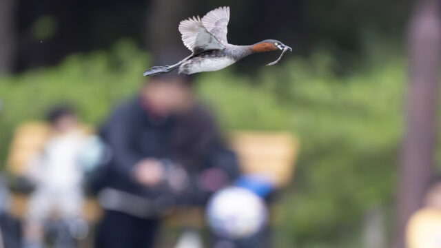 写真:飛ぶ!カイツブリ雨が降る前にひと回りし、雨が降り始めて戻ったら、午後の講演の準備を仕上げるという段取りで出ました。最初の観察地に入るなり、アトリのジュー ジェーが聞こえます。昨朝観察した大コナラを見ると、小鳥が多数いるのが見えました...